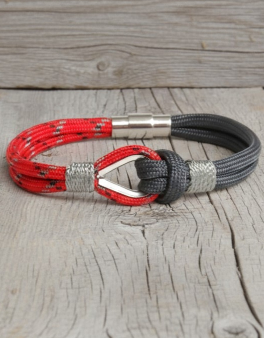 Wytrzymała i lekka bransoletka w marynistycznym stylu, wykonana z mocnego sznurka paracord w czerwono i szarych odcieniach. Centralnym elementem jest stalowa kausza z przewleczonym sznurkiem tworzącym charakterystyczny żeglarski węzeł. Idealna na lato i codzienne stylizacje – dodaje klasy i nawiązuje do tradycji żeglarskich.